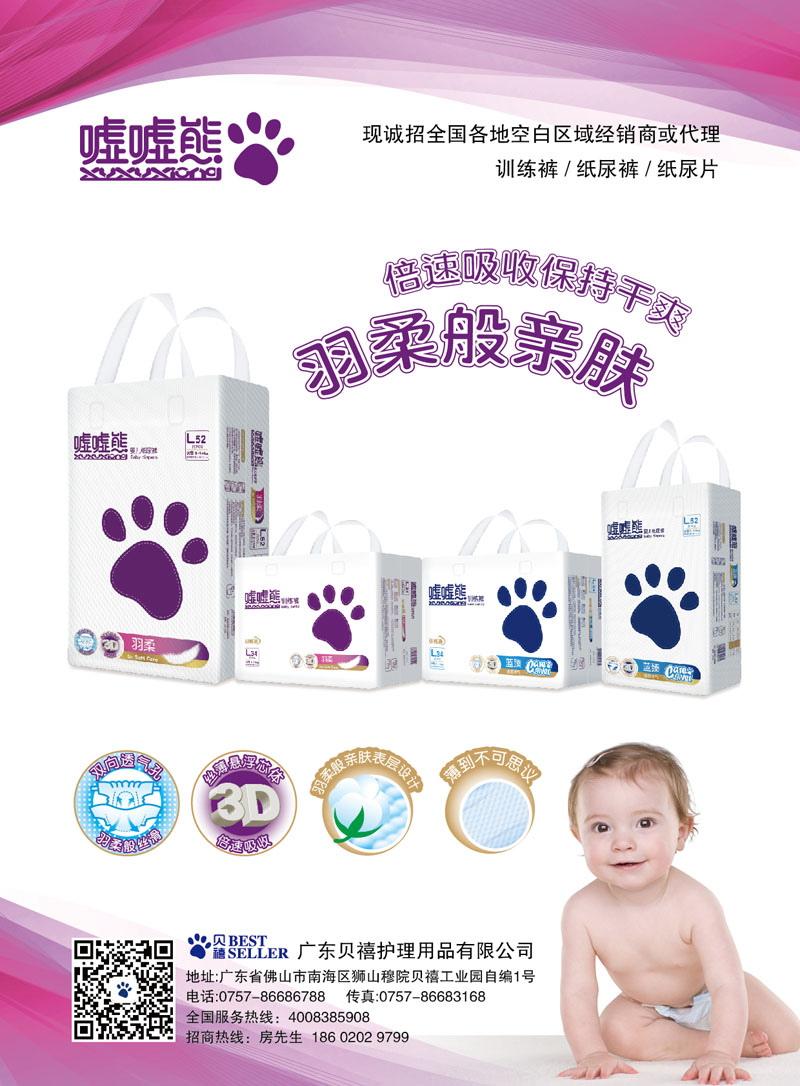 品牌名稱:噓噓熊 主營(yíng)產(chǎn)品:噓噓熊嬰幼兒紙尿褲 品牌特色:甄薄芯體 強(qiáng)力SPA高分子