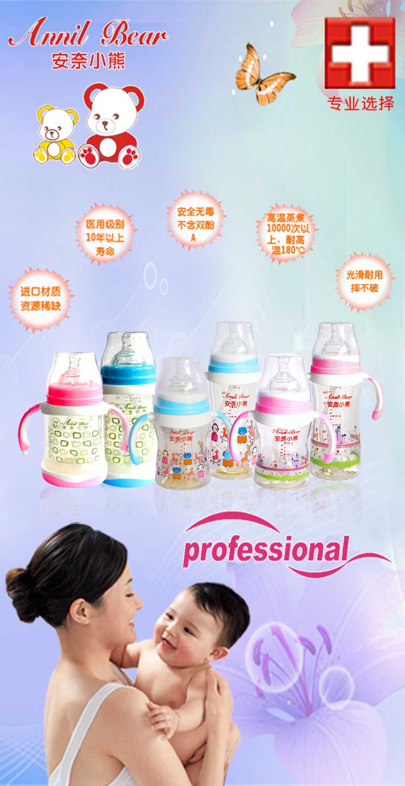 安奈小熊以“原材料安全、設(shè)計(jì)安全、工藝安全”為產(chǎn)品核心,現(xiàn)已開發(fā)晶鉆無痕玻璃奶瓶、硅膠奶瓶、PP奶瓶、PES奶瓶、ppsu奶瓶等奶瓶系列,滿足媽媽不同喂乳選擇需求。
