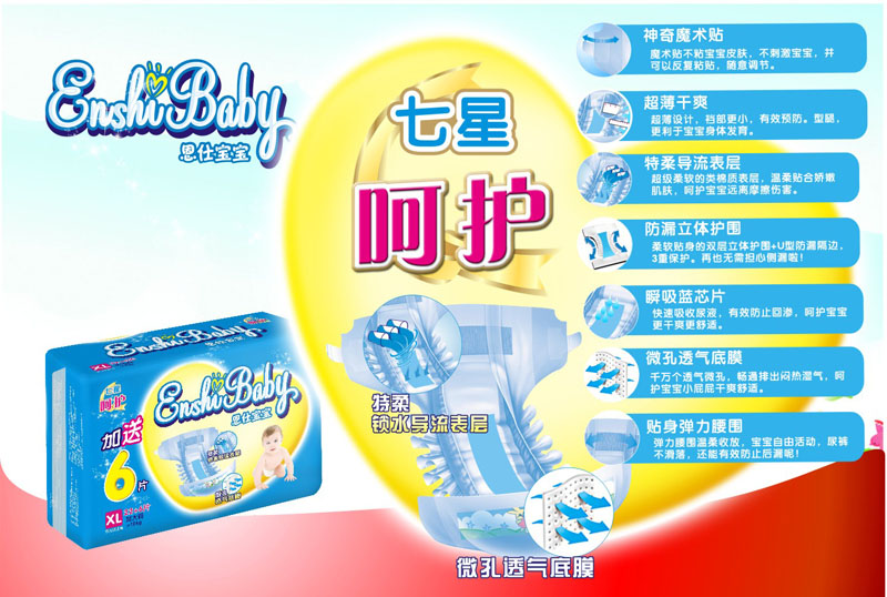 品牌名稱:恩仕寶寶 主營產(chǎn)品:恩仕寶寶紙尿褲/片招商 品牌特色:特柔超薄透氣 絕不紅屁股