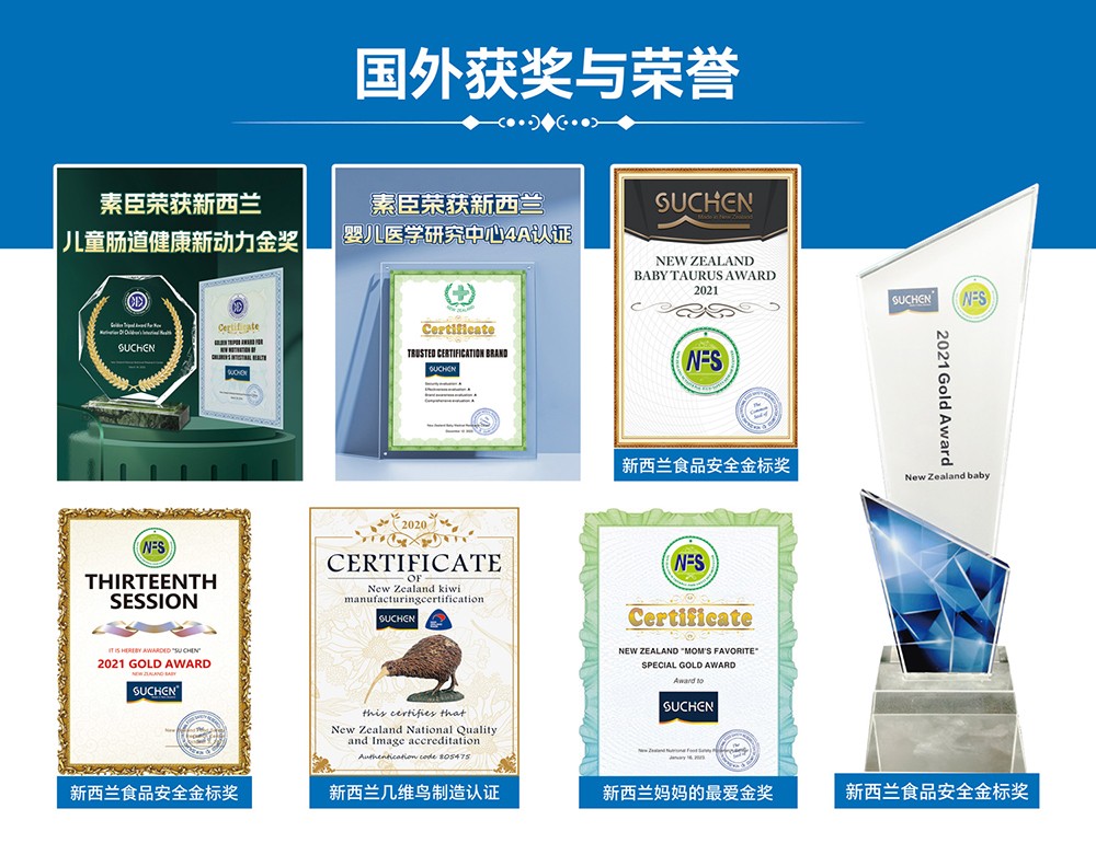 素臣多次斬獲國際健康獎(jiǎng)項(xiàng):被新西蘭營養(yǎng)食品安全研究中心認(rèn)證為全球健康與安全品牌,獲得新西蘭嬰兒醫(yī)學(xué)研究中心的國際幼兒腸道活力科學(xué)獎(jiǎng)和 4A 認(rèn)證。