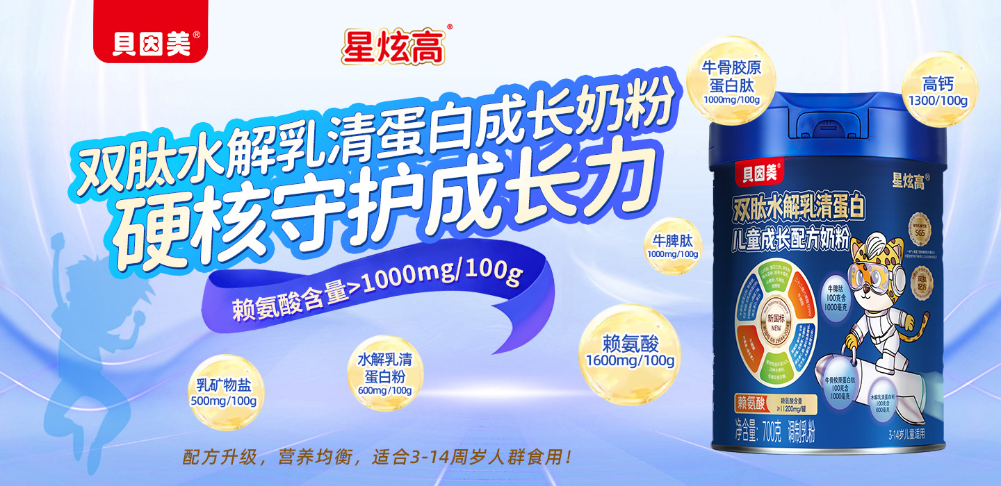 貝因美星炫高兒童成長配方奶粉,新國標(biāo)認(rèn)證,GB19644-2024,適合3-14周歲人群食用!嚴(yán)選優(yōu)質(zhì)奶源,源頭把控!賴氨酸含量>1000mg/100g,高含量更營養(yǎng)!同時(shí),每100g更添加乳礦物鹽500mg,高鈣1200mg,初乳堿性蛋白粉20mg,水解蛋黃粉10mg,葉黃素162mg,同時(shí)富含多種維生素和礦物質(zhì),均衡營養(yǎng)配比,好消化好吸收,守護(hù)成長健康!