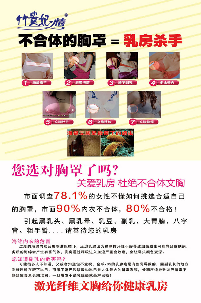 品牌名稱:竹貴妃情 主營產(chǎn)品:竹貴妃情激光纖維文胸,竹貴妃情能量褲 品牌特色:工藝升級,親膚舒適