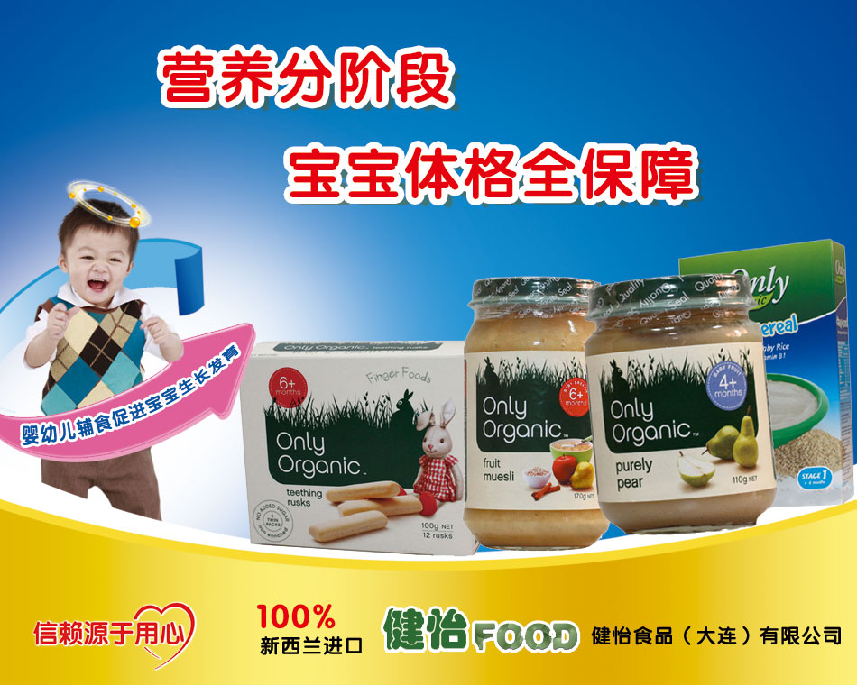 Onlyorganic(奧力)嬰幼兒有機(jī)食品,全部采用新西蘭本土新鮮的有機(jī)水果、蔬菜,經(jīng)新西蘭------有機(jī)食品體系現(xiàn)場(chǎng)監(jiān)督加工而成,非規(guī);a(chǎn),確保各批次產(chǎn)品質(zhì)地純正、有據(jù)可查。再由先進(jìn)的工業(yè)技術(shù)封閉罐裝,暢銷于南半球各大商超,成為新西蘭、澳大利亞等地區(qū)千萬(wàn)媽媽喂養(yǎng)嬰幼兒的必須產(chǎn)品。近年來(lái)Onlyorgani(奧力)產(chǎn)品已經(jīng)聲名遠(yuǎn)播,在新加坡、日本、韓國(guó)等亞太地區(qū)的發(fā)達(dá)國(guó)家已經(jīng)取得較好的銷量和口碑。