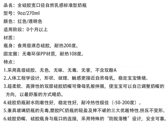 硅膠很柔軟,不用奶瓶刷用手也可以刷到奶瓶的各個角落,容易清洗。寶寶吸奶時,奶瓶會隨著奶水的減少而自動收縮,始終保持著瓶身內(nèi)外氣壓一致,避免寶寶吸入過多的空氣而導致嗆奶、腹脹等不適,有效解決喂奶時脹氣的煩惱,從而達到自動呼吸的功能。