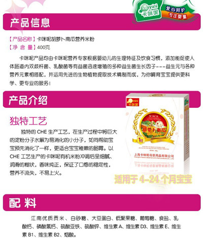 卡咪呢有機米粉系列是專為中國寶寶設計的營養(yǎng)輔食,選用有機大米,科學搭配維生素AD等維生素,還特別添加牛磺酸、DHA、AA等有助智力發(fā)育的營養(yǎng)成分,富含15種營養(yǎng)素,F(xiàn)上海卡咪呢母嬰用品有限公司面向全國空白市場區(qū)域誠招卡咪呢有機米粉代理商。