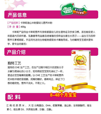 卡咪呢有機(jī)米粉系列是專為中國寶寶設(shè)計(jì)的營養(yǎng)輔食,選用有機(jī)大米,科學(xué)搭配維生素AD等維生素,還特別添加牛磺酸、DHA、AA等有助智力發(fā)育的營養(yǎng)成分,富含15種營養(yǎng)素。現(xiàn)上?ㄟ淠啬笅胗闷酚邢薰久嫦蛉珖瞻资袌鰠^(qū)域誠招卡咪呢有機(jī)米粉代理商。