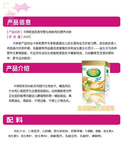 卡咪呢有機(jī)米粉系列是專(zhuān)為中國(guó)寶寶設(shè)計(jì)的營(yíng)養(yǎng)輔食,選用有機(jī)大米,科學(xué)搭配維生素AD等維生素,還特別添加;撬帷HA、AA等有助智力發(fā)育的營(yíng)養(yǎng)成分,富含15種營(yíng)養(yǎng)素,F(xiàn)上?ㄟ淠啬笅胗闷酚邢薰久嫦蛉珖(guó)空白市場(chǎng)區(qū)域誠(chéng)招卡咪呢有機(jī)米粉代理商。
