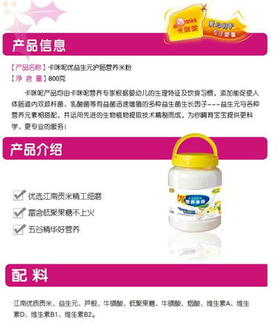 卡咪呢乳清蛋白嬰幼兒營養(yǎng)米粉是上?ㄟ淠啬笅胗闷酚邢薰酒煜庐a(chǎn)品,精選優(yōu)質(zhì)大米制作,特別添加乳清蛋白和益生元,提高寶寶抵抗力,促進寶寶changdao的消化吸收,上市以來廣受父母消費者的青睞。
