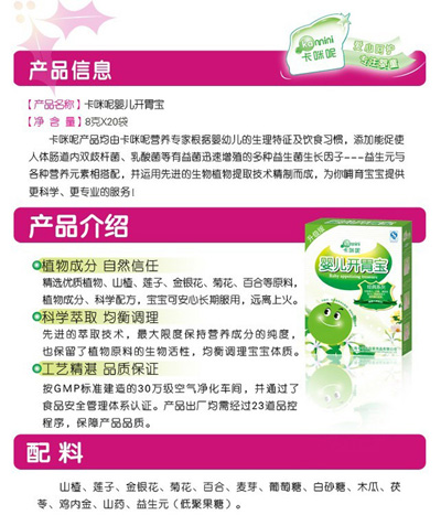 卡咪呢有機米粉系列是專為中國寶寶設(shè)計的營養(yǎng)輔食,選用有機大米,科學(xué)搭配維生素AD等維生素,還特別添加;撬帷HA、AA等有助智力發(fā)育的營養(yǎng)成分,富含15種營養(yǎng)素,F(xiàn)上海卡咪呢母嬰用品有限公司面向全國空白市場區(qū)域誠招卡咪呢有機米粉代理商。