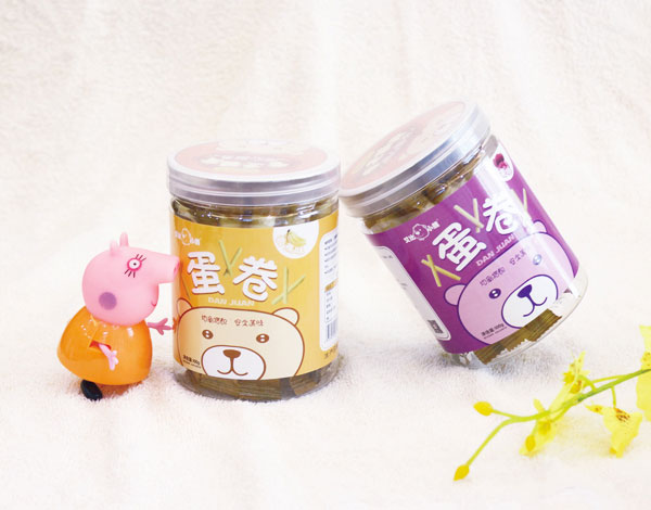 艾比小熊蛋卷系列共包含5種口味,紫薯、椰奶、香蕉、海苔、草莓;精選面粉,含礦物質(zhì)、無(wú)機(jī)鹽、蛋白質(zhì),加入雞蛋液、各種果蔬汁、奶汁、海苔碎片等,經(jīng)成糊、成卷、涂抹植物油烤焙而得,蛋卷色澤金黃偏向其中所加
