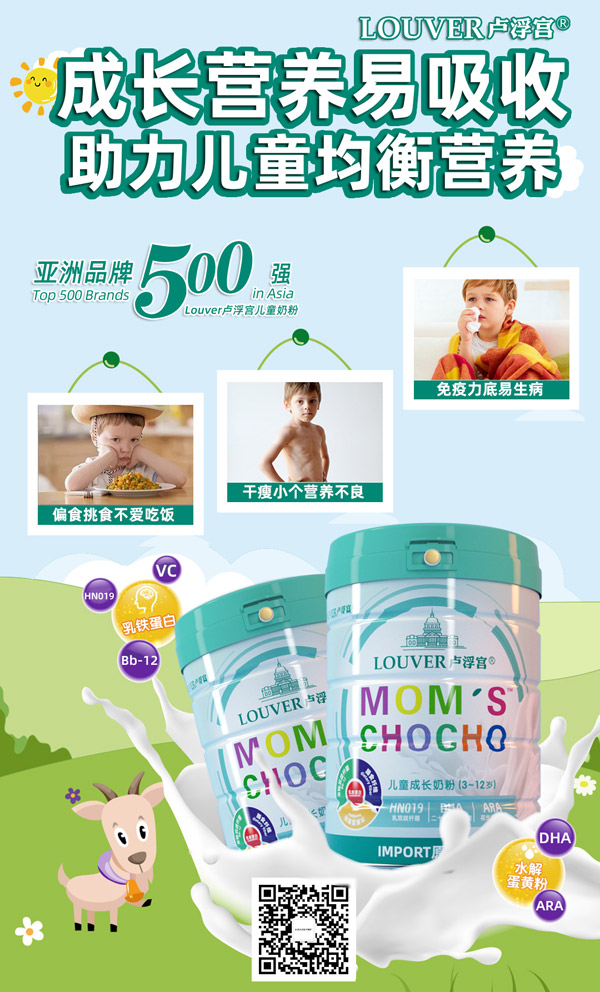 盧浮宮·兒童成長(zhǎng)奶粉,助力兒童營(yíng)養(yǎng)成長(zhǎng),根據(jù)中國(guó)3-12歲兒童生長(zhǎng)的營(yíng)養(yǎng)需求,選用優(yōu)質(zhì)生牛乳為原料,添加雙重益生菌、DHA&ARA、乳鐵蛋白、水解蛋黃粉、膳食纖維、膽堿、多種維生素及礦物質(zhì)等營(yíng)養(yǎng)物質(zhì),含有全面豐富的營(yíng)養(yǎng)素,為中國(guó)兒童成長(zhǎng)提供優(yōu)質(zhì)的營(yíng)養(yǎng)補(bǔ)充。