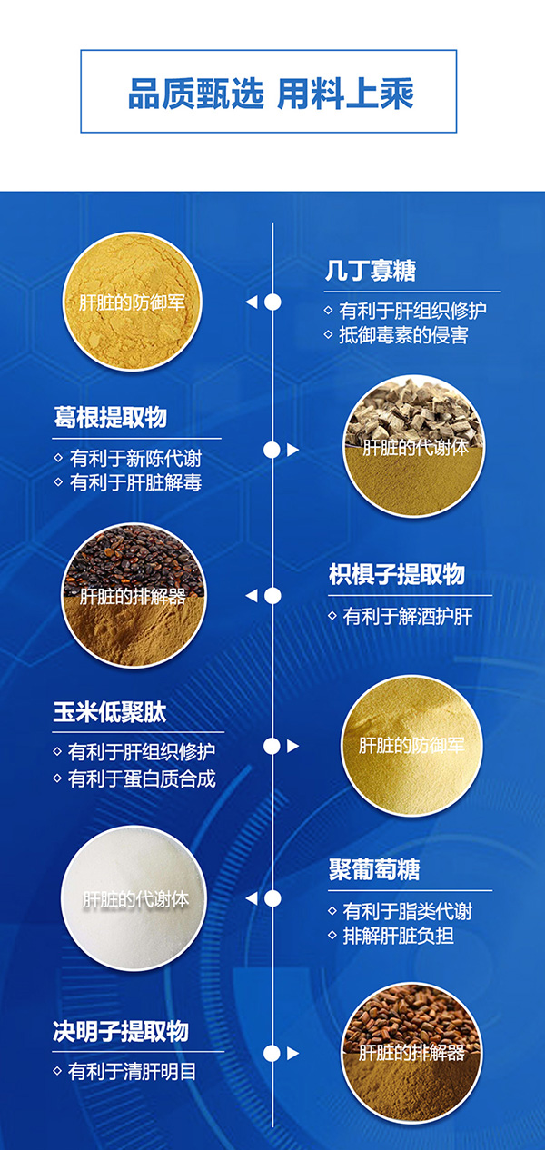 生命益元素天帝仁旰樂吧優(yōu)選幾丁寡糖、葛根提取物、枳椇子提取物、玉米低聚肽、決明子提取物、聚葡萄糖為主要原料組成重要配方,運用優(yōu)良的生產技術及工藝,經過嚴格的品質控制精致而成,保護肝臟,無懼熬夜酒戰(zhàn)。