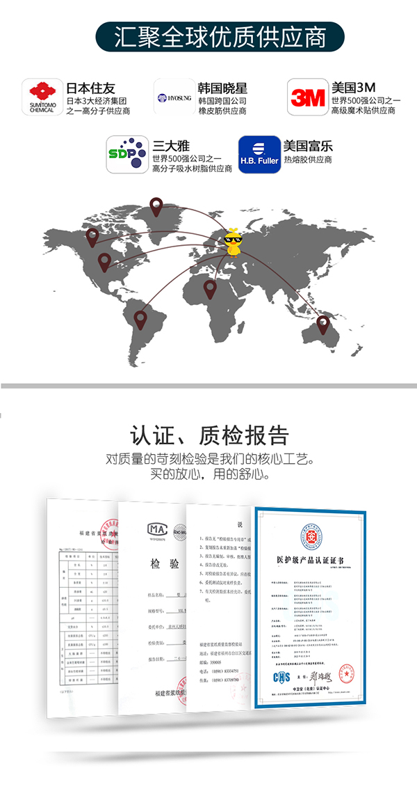 進(jìn)口高分子結(jié)構(gòu),可以吸收約自身重量30倍的水分,保持屁屁持久干爽