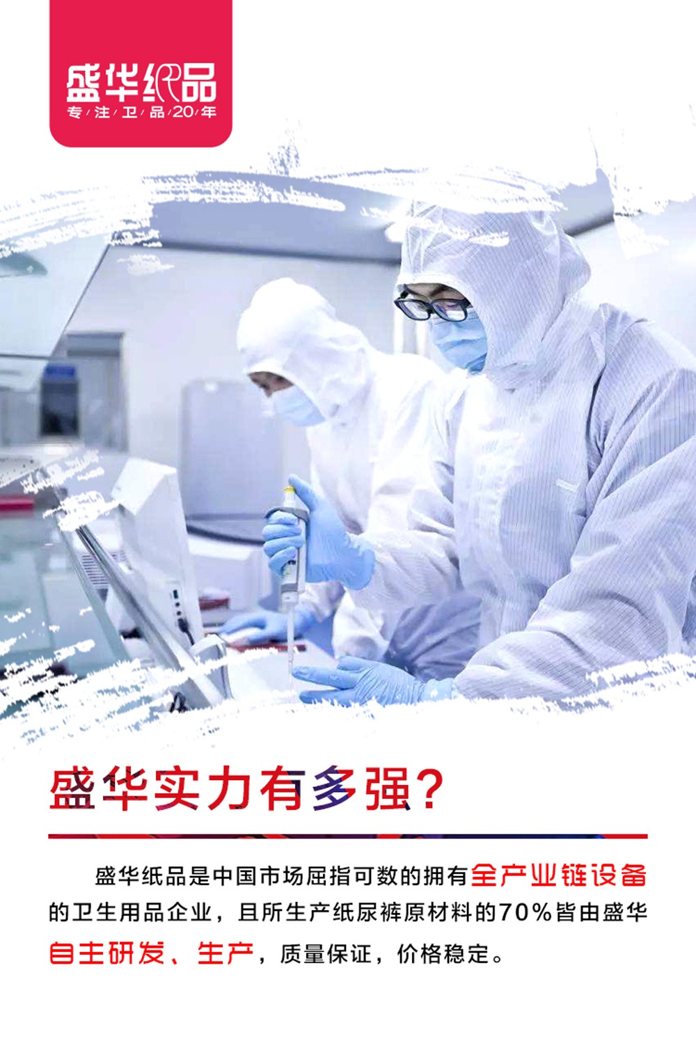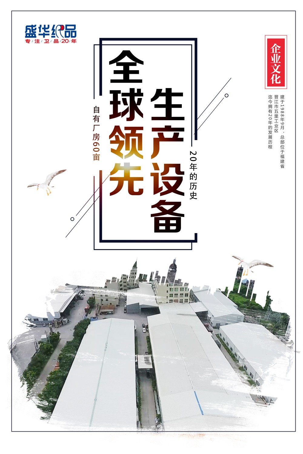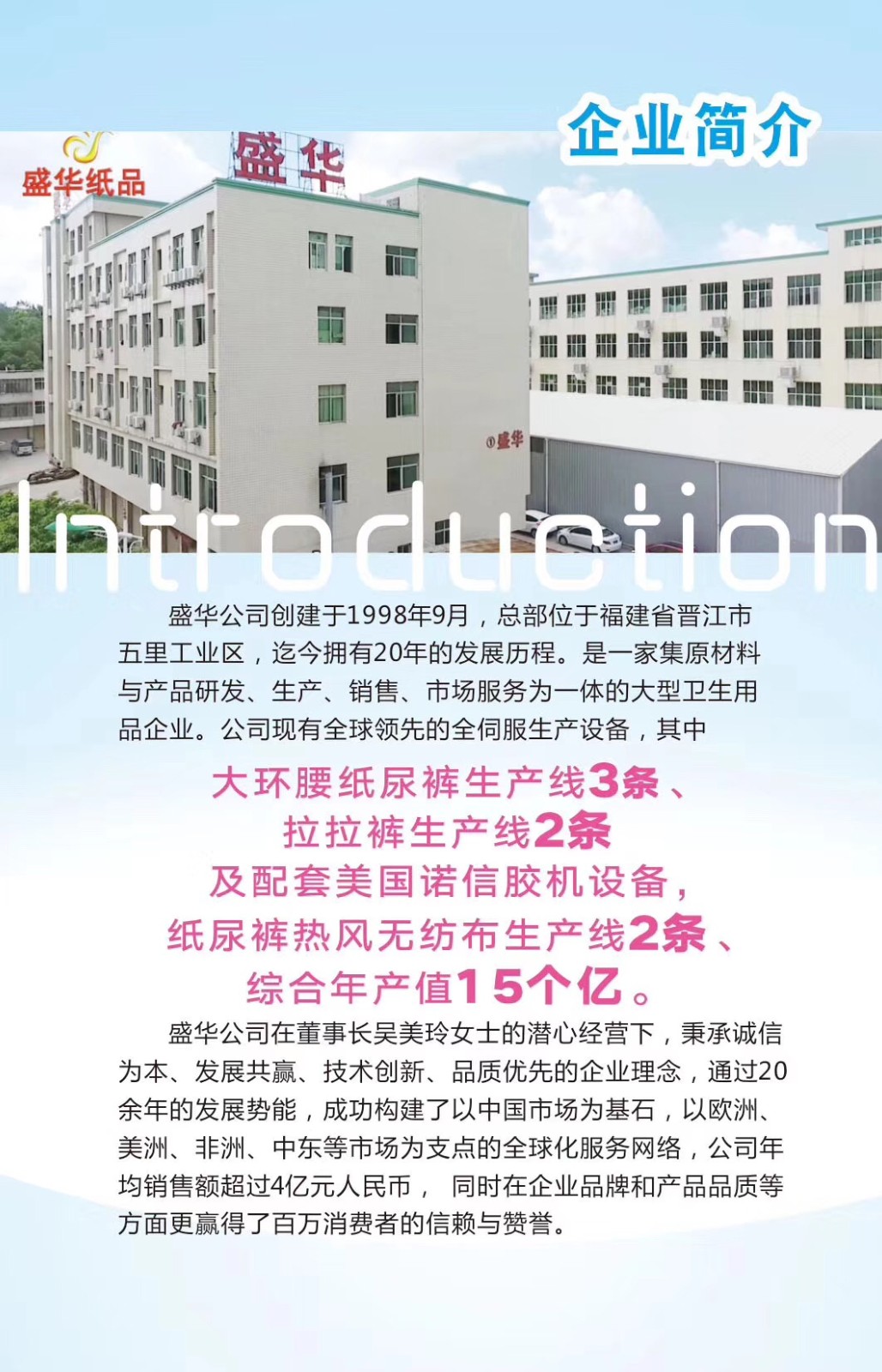 盛華紙品有限公司創(chuàng)建于1998年9月,總部位于福建省晉江市五里工業(yè)區(qū),迄今擁有22年的發(fā)展歷程。是一家集原材料與產品研發(fā)、生產、銷售、市場服務為一體的大型衛(wèi)生用品企業(yè)。