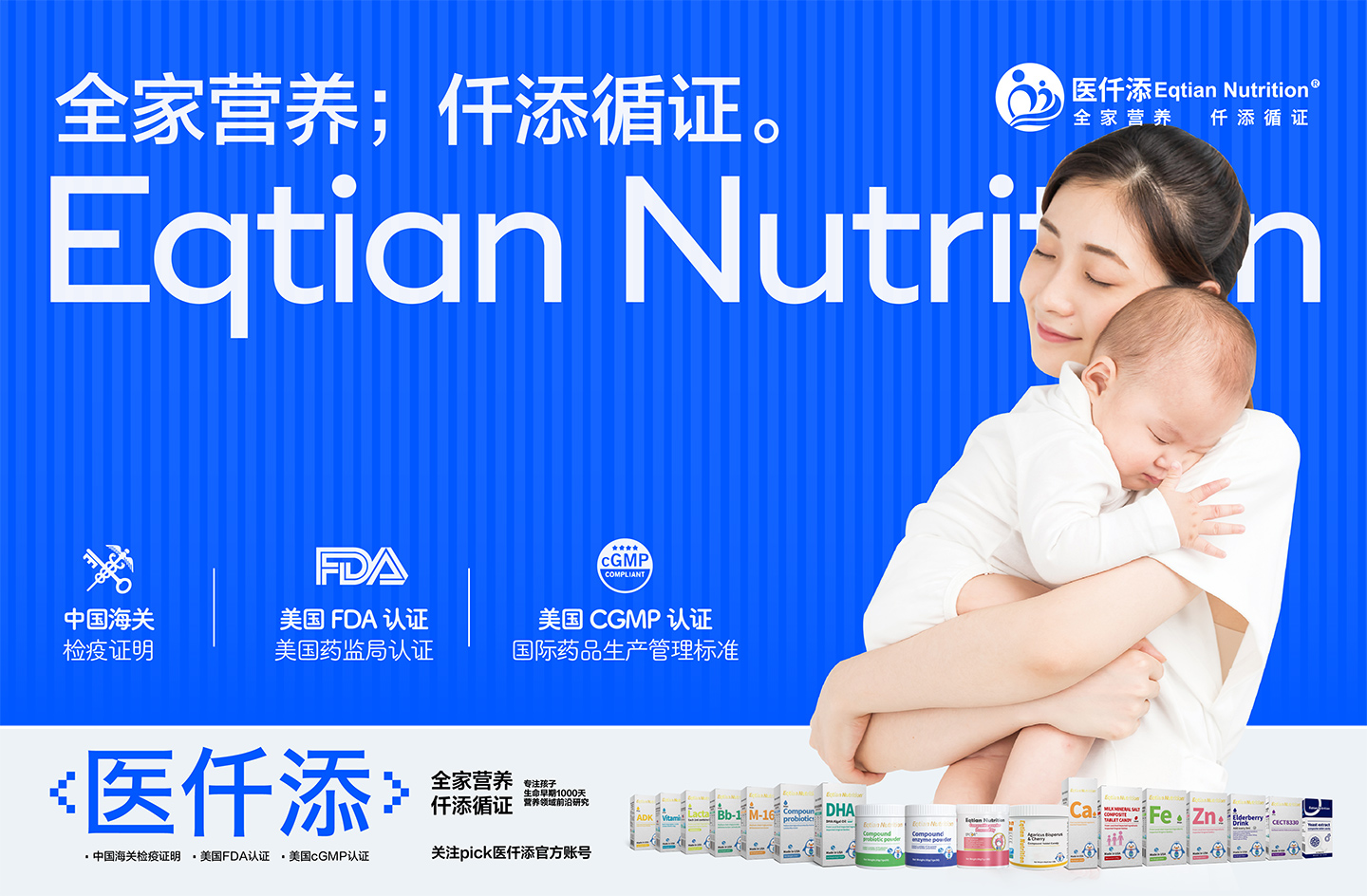 Eqtian Nutrition醫(yī)仟添系列產(chǎn)品均來自美國EQTIAN NUTRITION INC.企業(yè)生產(chǎn),堅持采用天然原材料加工 ,嚴格把關每一道生產(chǎn)過程。產(chǎn)品都通過了美國權(quán)威FDA認證,按照美國cGMP(國際藥品生產(chǎn)管理標準)條例生產(chǎn)。醫(yī)仟添自成立以來,一直致力于對營養(yǎng)學與健康食品臨床研究與開發(fā)方面的努力探索,以科學的方式為千萬家庭傳播愛與健康,這是企業(yè)品牌文化使然,健康婦幼,營養(yǎng)先行。讓醫(yī)仟添守護每一個中國家庭的營養(yǎng)健康。愛之有道,計之深遠——為孩子,也為自己!