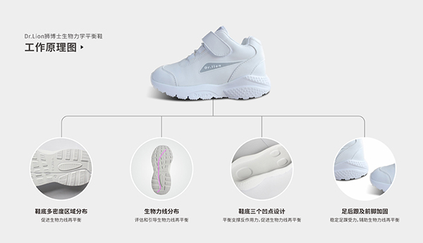 “Dr.Lion獅博士”品牌研發(fā)團(tuán)隊(duì)根據(jù)青少兒不同年齡段的骨骼特征,把套餐進(jìn)行了細(xì)分,分別設(shè)計(jì)了“學(xué)步鞋套餐、穩(wěn)步鞋套餐、健步鞋套餐”,為我國(guó)青少兒帶去更多專業(yè)、細(xì)致的健康管理產(chǎn)品和服務(wù)。Dr.Lion獅博士生物力學(xué)平衡鞋,主要根據(jù)生物力學(xué)原理,通過鞋底多密度區(qū)域分布,生物力線分布,寬窄分布,鞋面的側(cè)面加固,以及鞋墊的定制匹配,從力學(xué)的原理上去調(diào)整生物力線,從而使失去平衡的生物力線趨于再平衡,穩(wěn)固行走中的足踝。