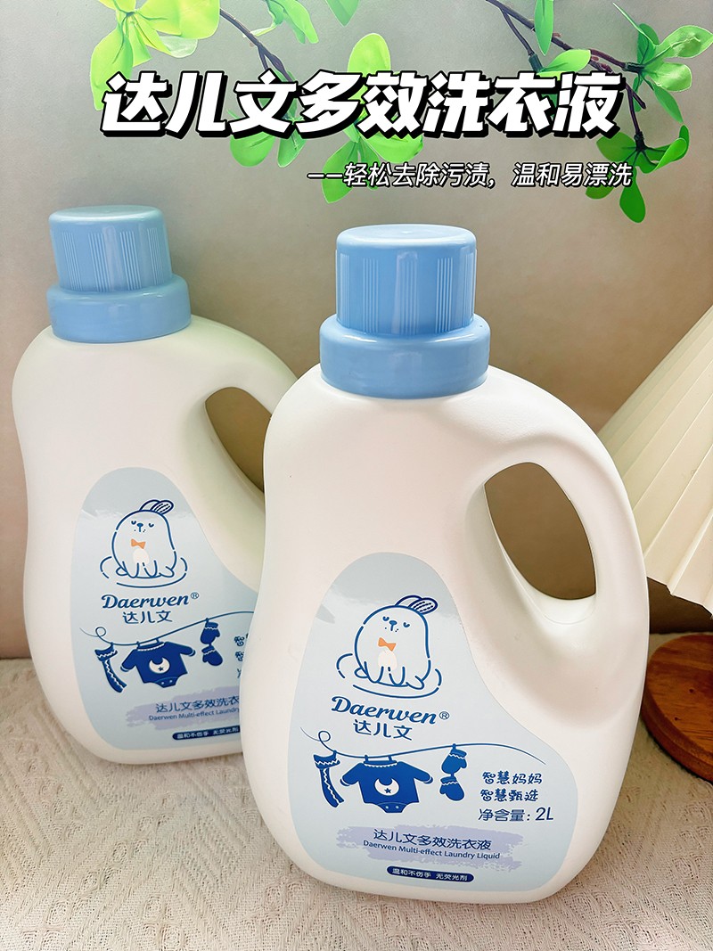 達(dá)兒文多效洗衣液,高效去污,洗后衣服潔凈柔軟。深層去污,溫和柔順,植物萃取。